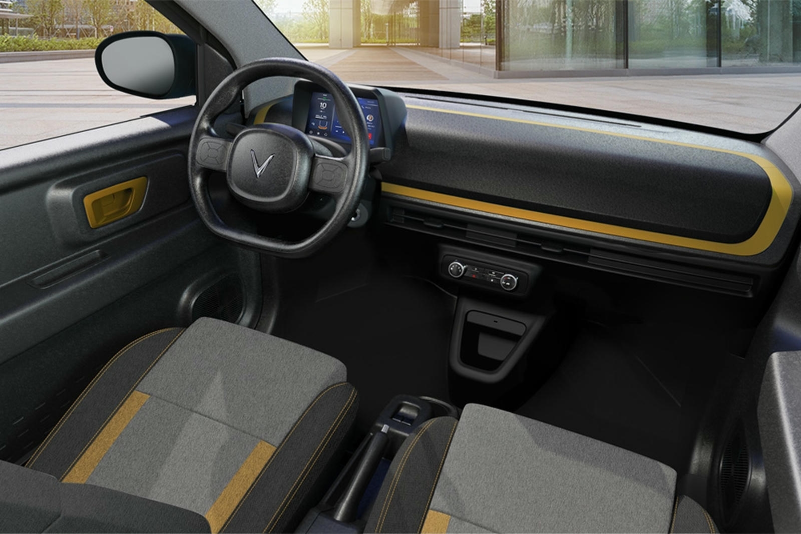 Vô-lăng xe dạng vát đáy với 2 chấu thể thao, cá tính. Ghế xe nhiều khả năng bọc nỉ sáng màu kèm các chi tiết màu xanh tạo điểm nhấn trẻ trung, bắt mắt.